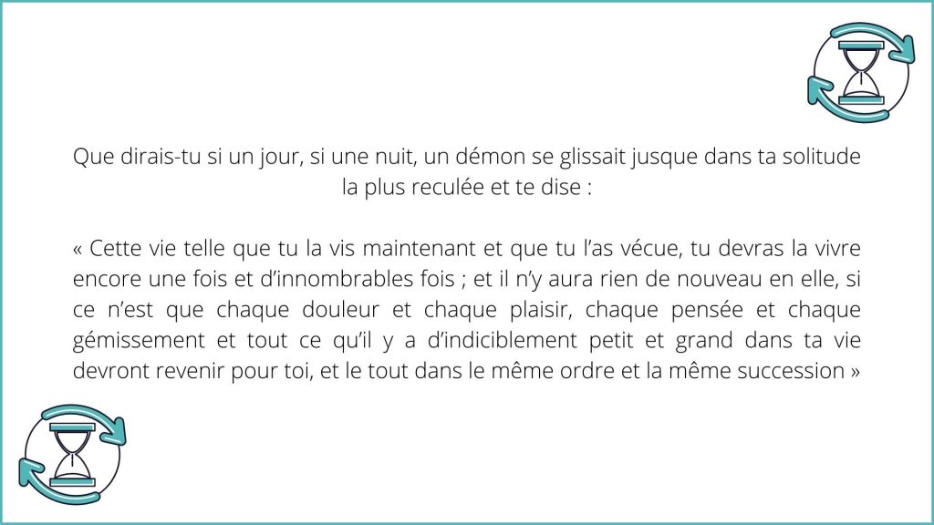 Imaginez-vous vivre en boucle votre vie. La même que celle de maintenant, seconde après seconde. Comment réagiriez-vous ? Seriez-vous désespéré.e ou ravi.e ? Cette expérience peut vous donner des indices sur la façon dont vous considérez la vie que vous menez.